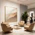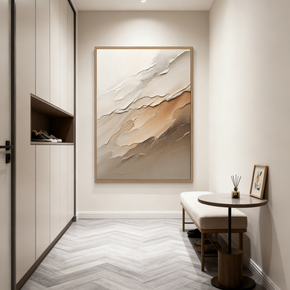 Features layered palette-knife textures in warm beige and sand tones, embodying modern abstract minimalism.