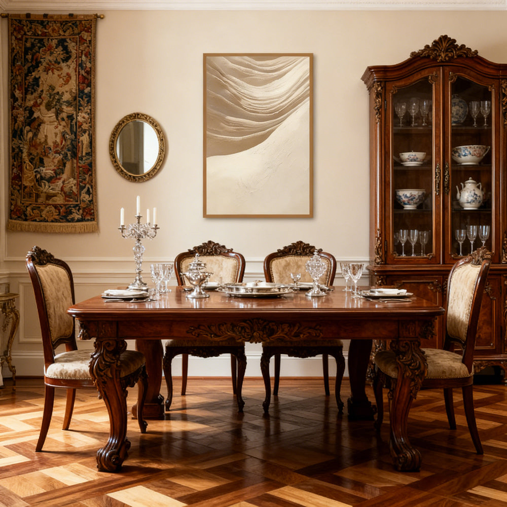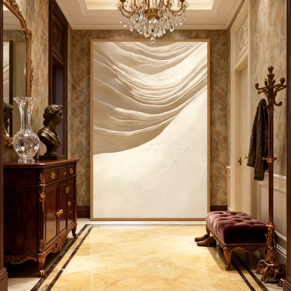 This artwork adopts a minimalist abstract approach, depicting gentle, wave-like sand formations that evoke the calm rhythm of desert landscapes. With subtle tonal transitions and hand-crafted texture work, it exudes a serene and refined artistic atmosphere. Each painting is individually created by hand, ensuring every piece is a unique work of wall art that enriches contemporary living spaces.
