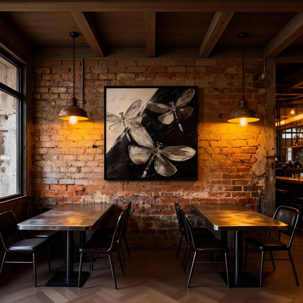 • A contemporary minimalist artwork depicting dragonflies in elegant monochrome tones, symbolizing freedom and transformation.