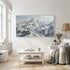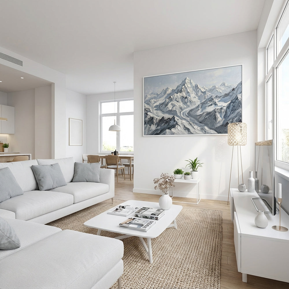 This artwork uses expressive impressionist palette-knife techniques to sculpt majestic snowy peaks and winding glacier-like valleys. The bold textures and layered whites and grays create powerful visual depth inspired by impressionist landscape traditions. Its unique charm lies in the sweeping river-shaped formations across the mountains, offering a sense of movement, grandeur, and awe within the frozen world.