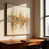 • Features a structured golden grid layered over textured abstract blocks, blending geometry with expressive impasto strokes.