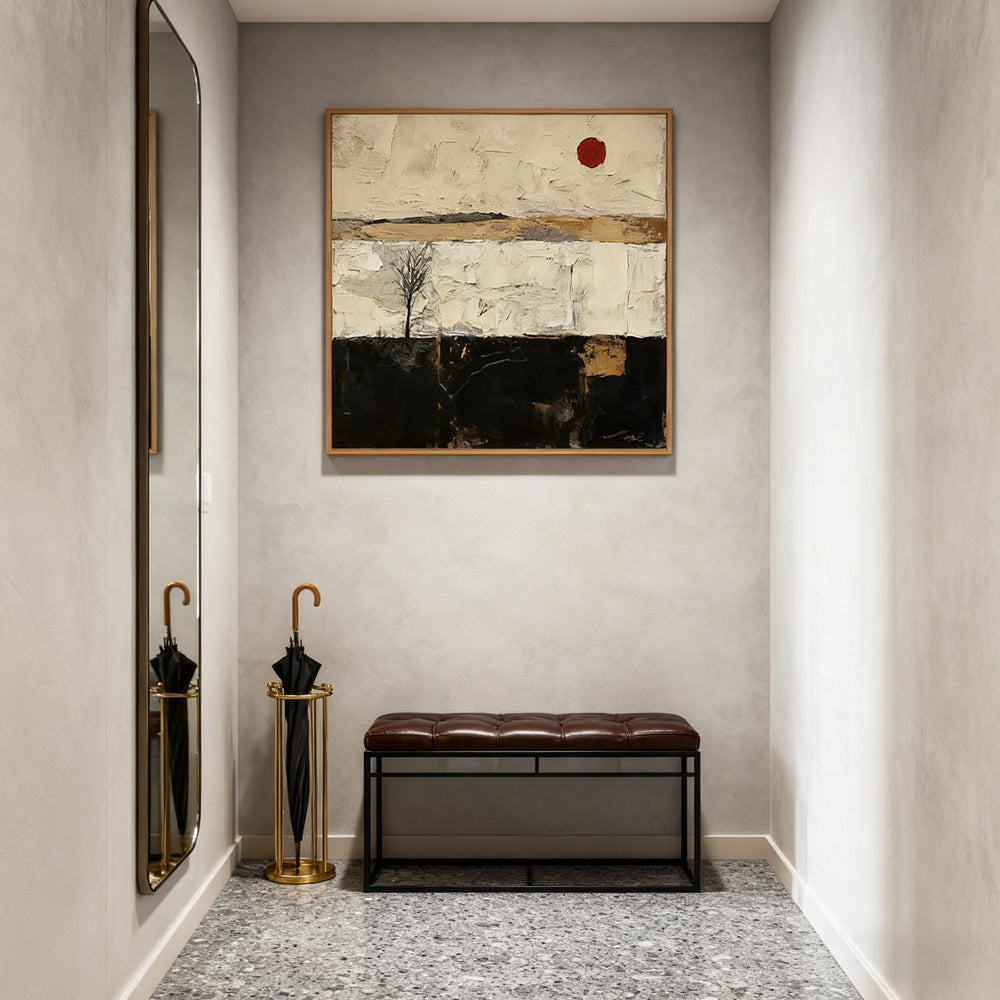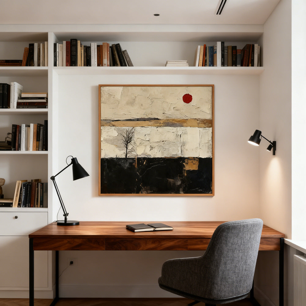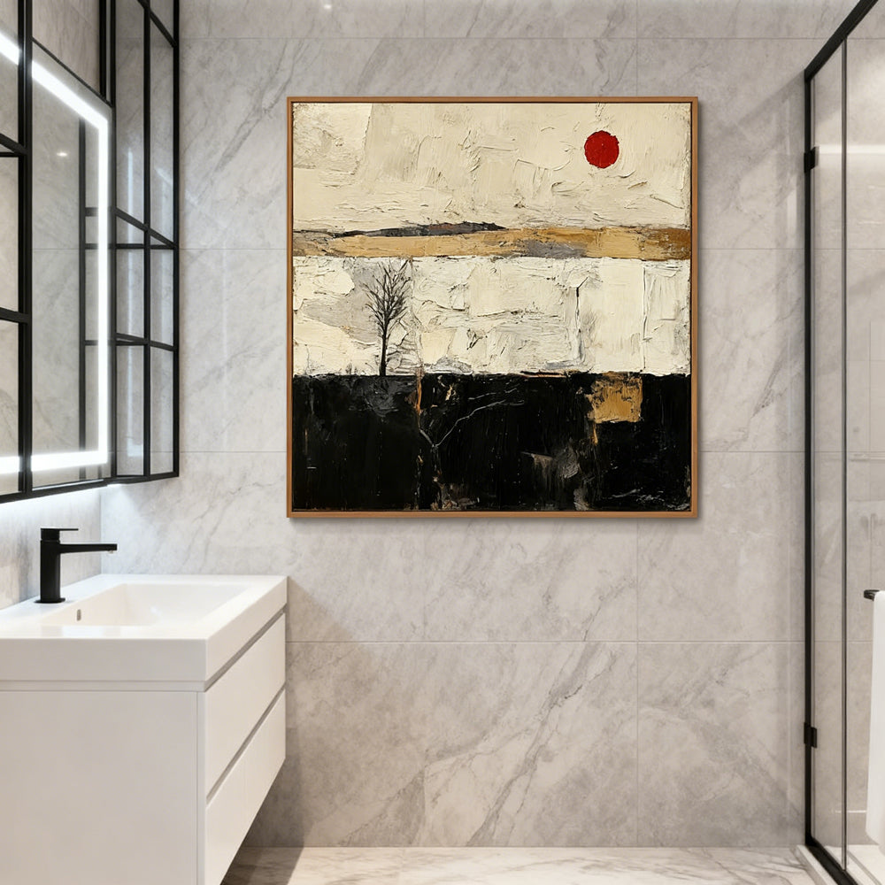 Lone Tree & Red Sun Landscape Theme Painting – Modern Abstract Style Handmade Oil Painting Wall Art