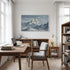 This artwork embraces a refined realist style, using delicate brushwork and layered cool tones to portray vast mountain ranges with remarkable depth. Inspired by classical landscape painting, it highlights the serene grandeur of snow-covered peaks and distant mist. Its uniqueness lies in the subtle lighting that softens the rugged terrain, creating an atmosphere of tranquility, purity, and awe.