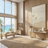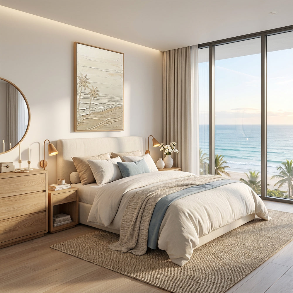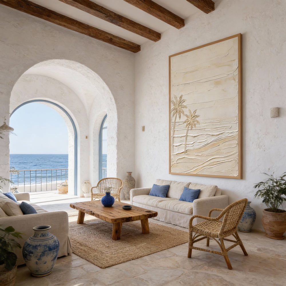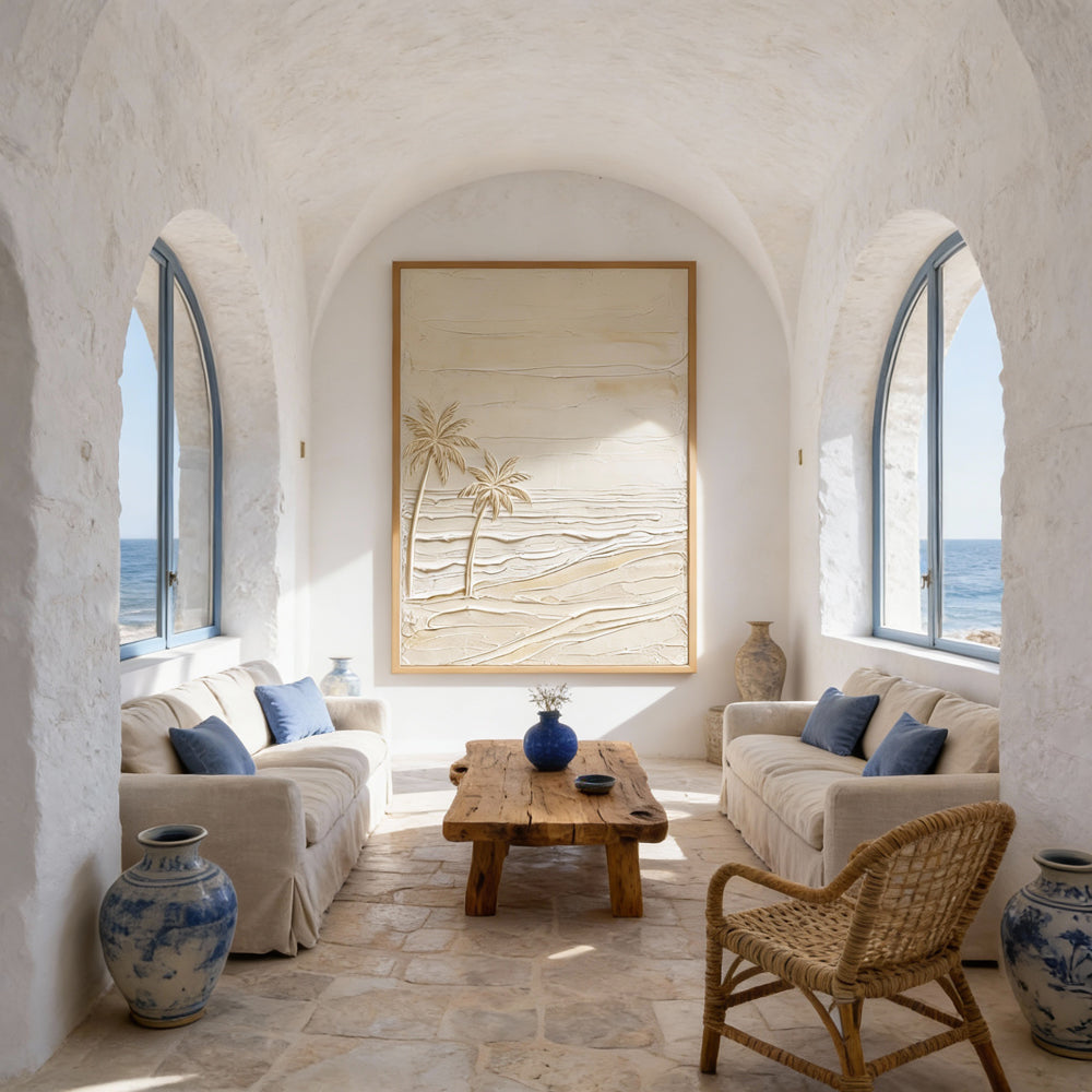 This painting represents a modern minimal coastal style, focusing on simplicity, texture, and emotional quietness. Gentle horizontal strokes suggest waves and shoreline, while slender palm trees rise softly from the sandy foreground. The restrained color palette enhances the sense of calm and balance, allowing texture to become the primary visual language. Fully hand-painted, every layer of oil paint is applied by hand, creating subtle variations that cannot be replicated. This wall art embodies coastal stillness and refined minimalism, making it a unique and elegant statement for serene living spaces.One-of-a-kind wall art conveying peace and openness