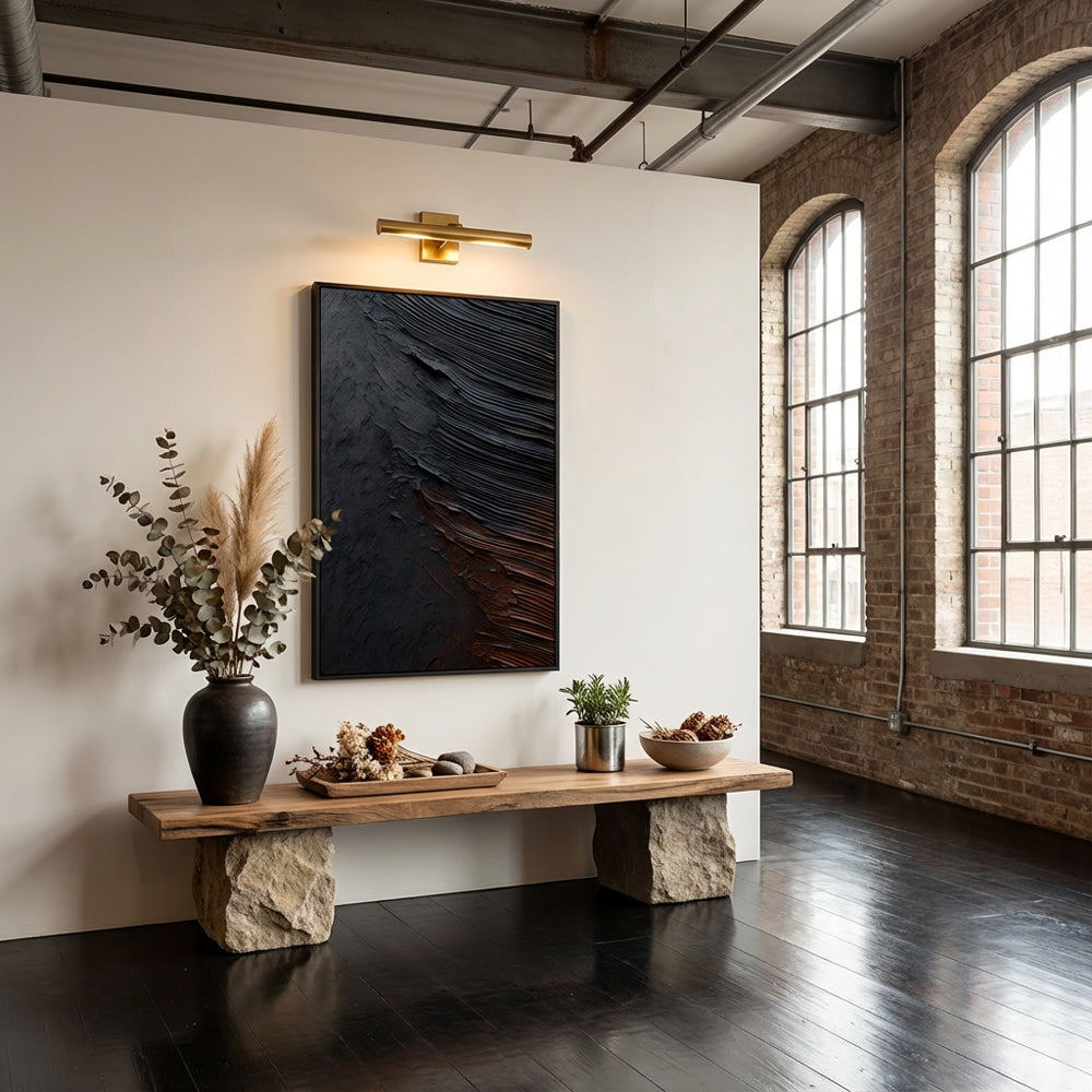 Ambiance: The rich palette of charcoal black and deep umber, contrasted with rusty orange highlights, evokes a timeless, elemental landscape, inviting contemplation and adding a touch of sophisticated drama to your walls.