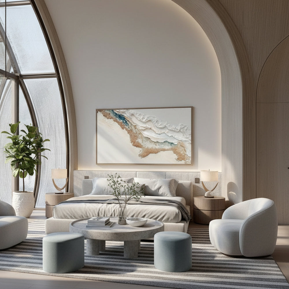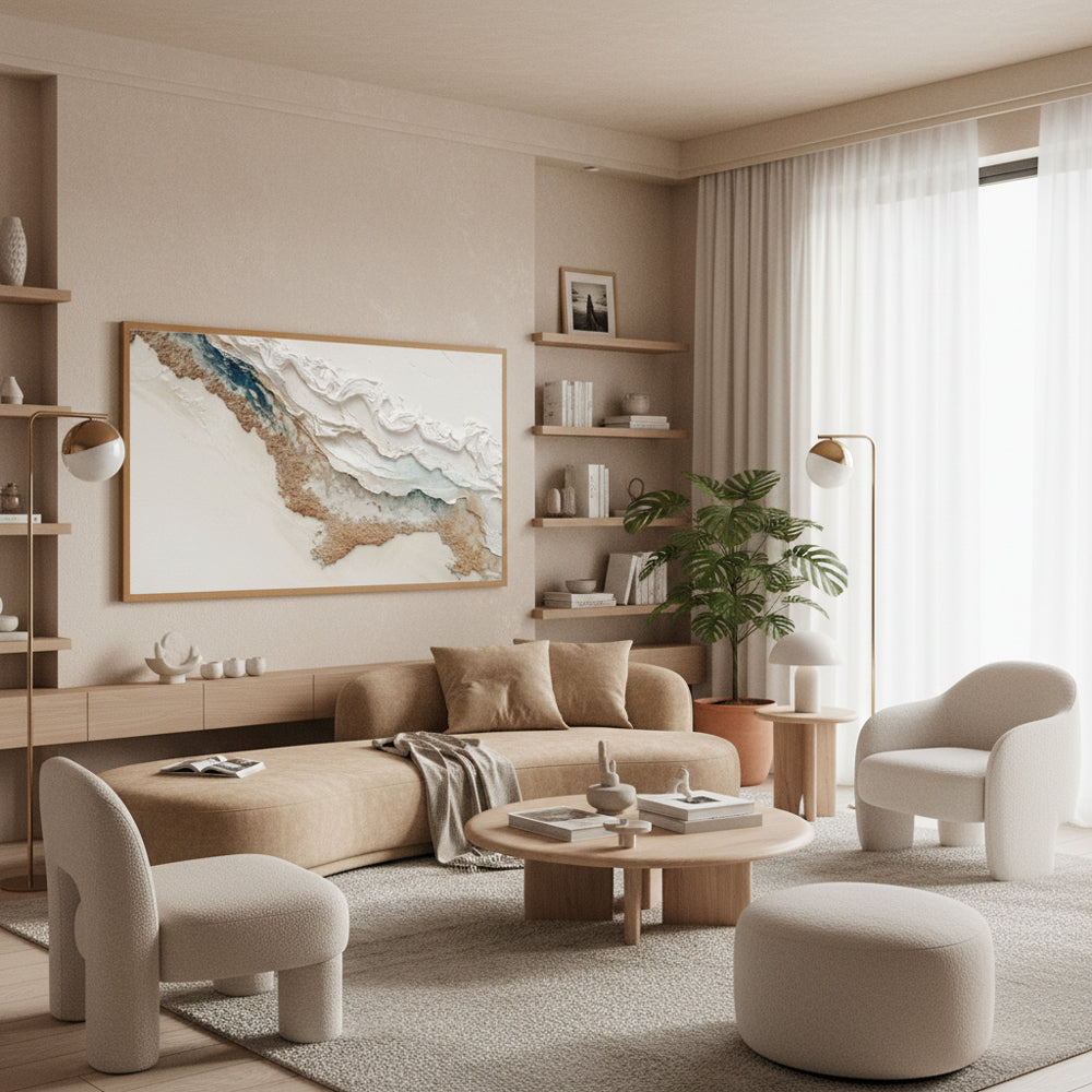 This artwork reimagines coastal drift lines through smooth abstract layers and harmonious earth-tone transitions. The hand-built textures form a sculptural surface that mimics waves meeting sand, adding both movement and serenity to the visual experience. As a one-of-a-kind textured oil painting, it enhances any space with calming coastal ambiance and sophisticated modern artistry.