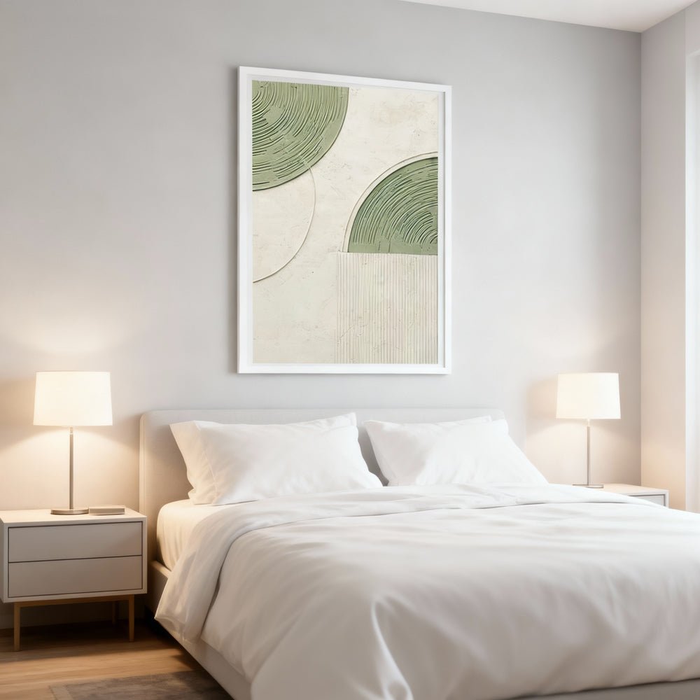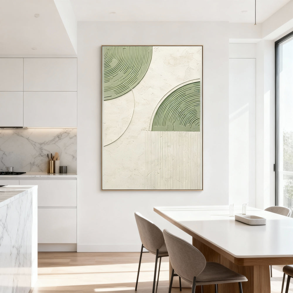 Style & Elements: This painting features a minimalist geometric design, with smooth circular patterns and textured elements. The subtle green and neutral tones create a sense of tranquility and balance, making it perfect for modern interiors.