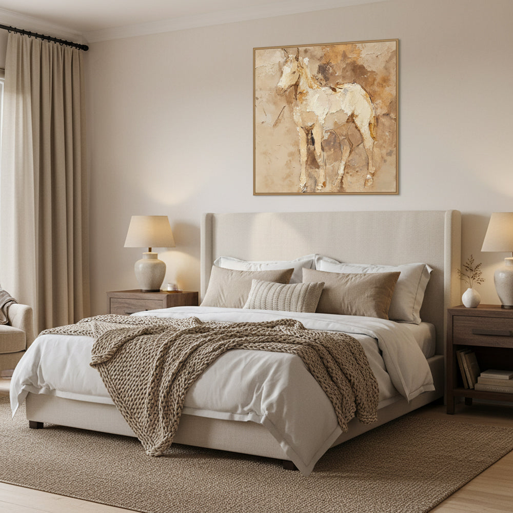 This handcrafted impasto painting features a softly rendered horse formed through rich, layered textures and warm neutral tones. The artwork reflects an expressive contemporary style, capturing both the gentle strength and quiet elegance of the animal. Each stroke is applied by hand, giving the piece a unique tactile depth and a serene atmospheric quality. As a one-of-a-kind wall art piece, it brings natural grace and artistic sophistication to any interior space.