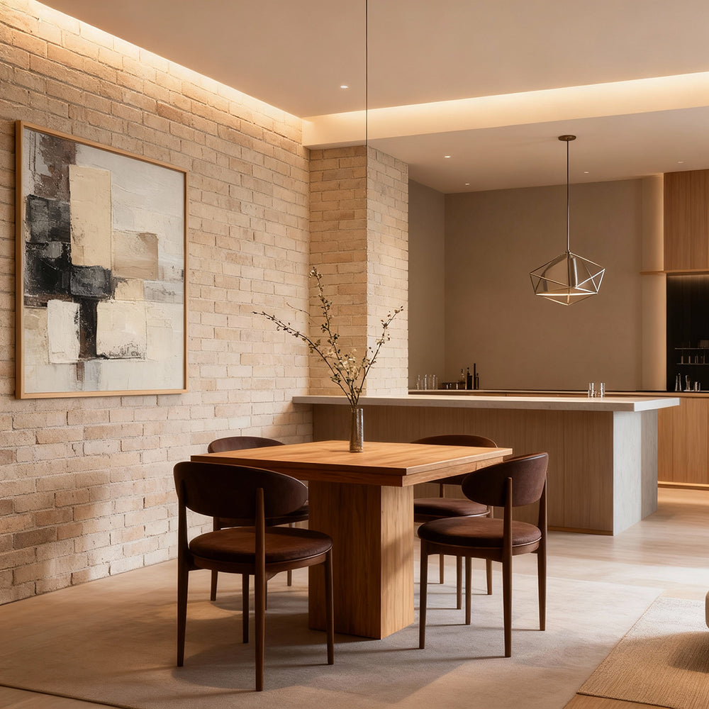 The interplay of beige, black, and grey tones expresses balance, calmness, and understated sophistication.