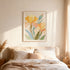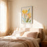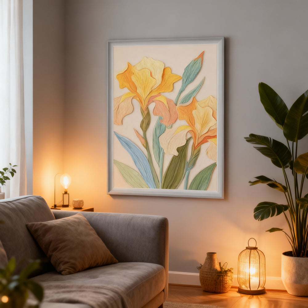 Impressionist Style & Elements: This artwork showcases classic Impressionist techniques with soft, blended brushstrokes that capture the play of light. It features delicate irises in warm yellows and peaches, accented by expressive green and blue foliage.