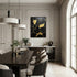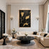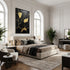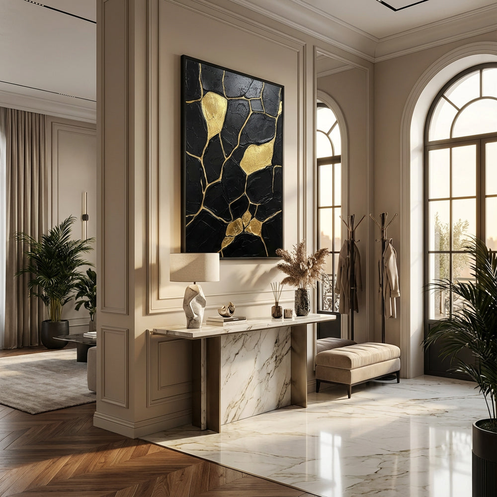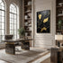 This painting represents a contemporary abstract black-and-gold style, focusing on balance between stillness and movement. Organic gold veins flow across matte black textures, creating a refined rhythm and visual tension. The thick oil application enhances depth and highlights the handcrafted quality of the work. Completely hand-painted, no two pieces share the same pattern or energy. This wall art embodies quiet strength and understated luxury, offering a timeless artistic presence that elevates modern living or commercial spaces.One-of-a-kind wall art conveying calm power and elegance