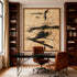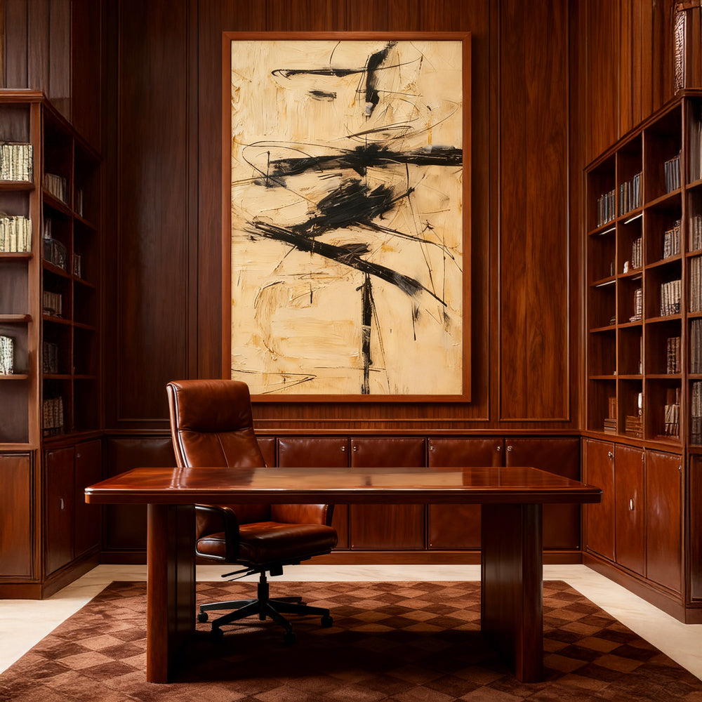 • Bold abstract brushwork with expressive black strokes on a warm beige textured background.