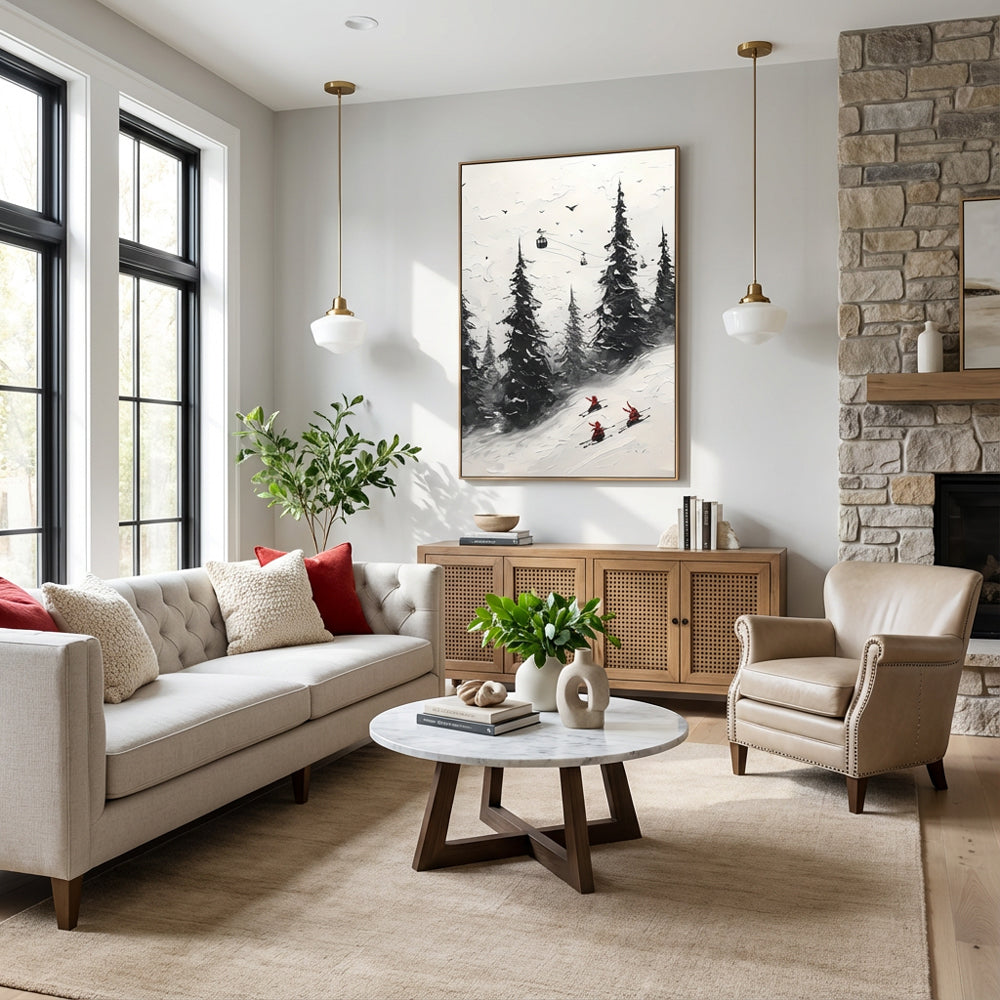 Uses impressionist brushwork to portray snowy forests, cable cars, and skiers with lively texture and atmospheric depth.