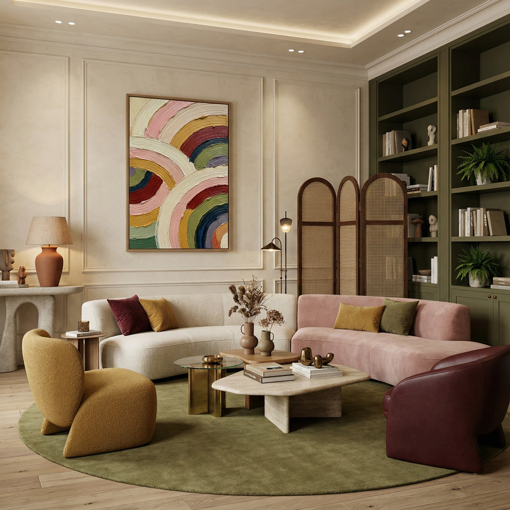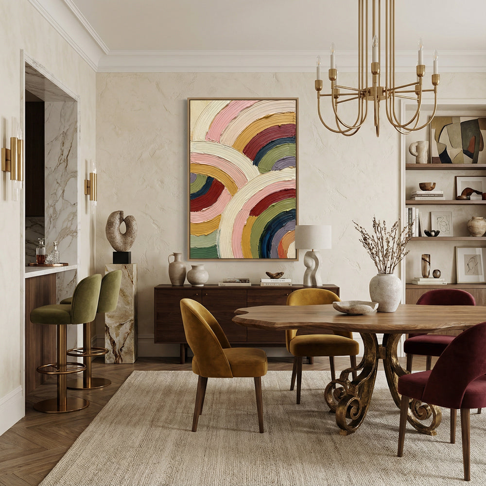 • This artwork is created in a contemporary abstract style, inspired by repeating arc and rainbow-like forms. Soft cream, blush pink, olive green, warm yellow, burgundy, and muted blue are layered in sweeping curves, creating a sense of harmony and visual balance. Thick oil paint is applied entirely by hand using a palette knife, resulting in pronounced textures and rhythmic movement across the canvas. Each painting is individually crafted, making it truly unique. As a modern wall art piece, it brings warmth, optimism, and refined artistic character to living spaces, bedrooms, or minimalist interiors.
