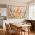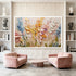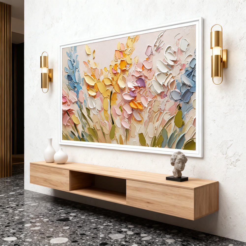 This stunning floral oil painting features a vibrant blend of soft pinks, yellows, blues, and greens, crafted using palette knife techniques for a textured, dimensional effect. The flowers appear to bloom off the canvas, giving the piece a lively, refreshing atmosphere.