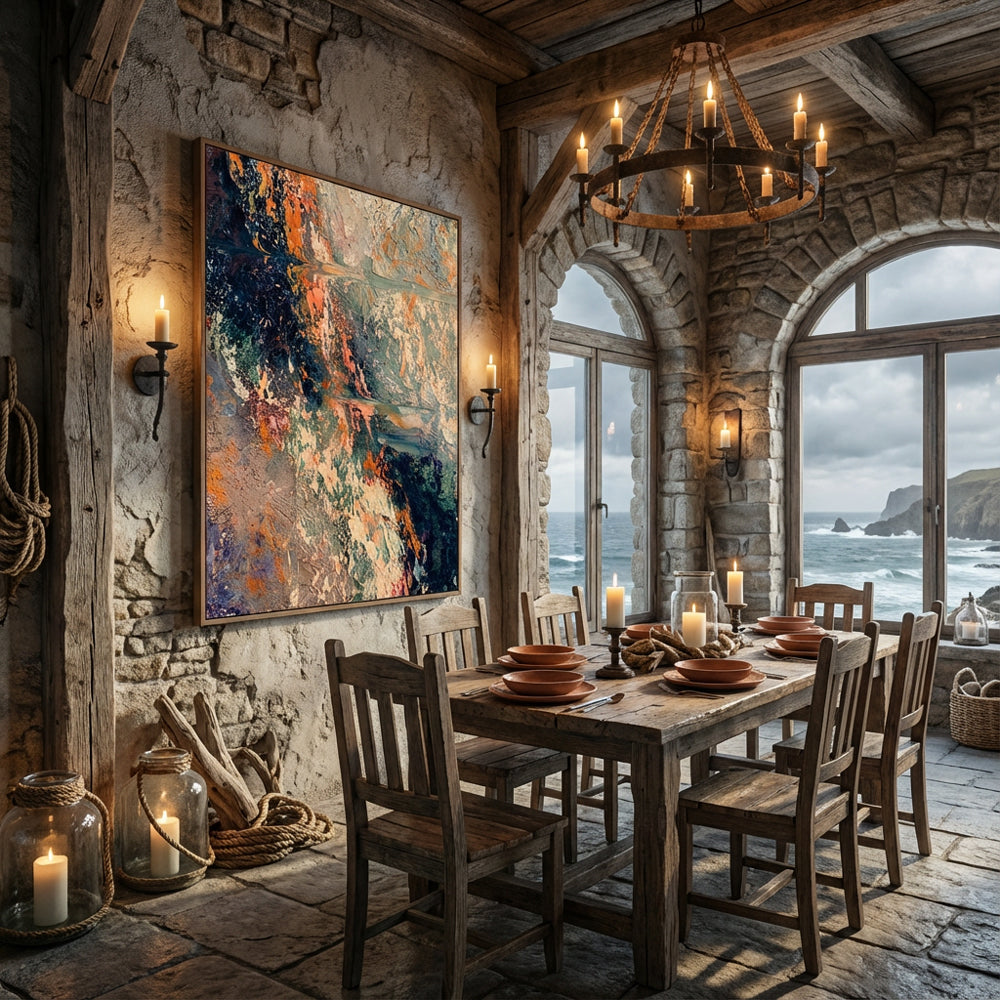 Crafted entirely by hand, the thick oil layers create a tactile, almost sculptural surface, allowing light and shadow to shift throughout the day. The painting invites interpretation—suggesting movement, erosion, and emotional transitions.