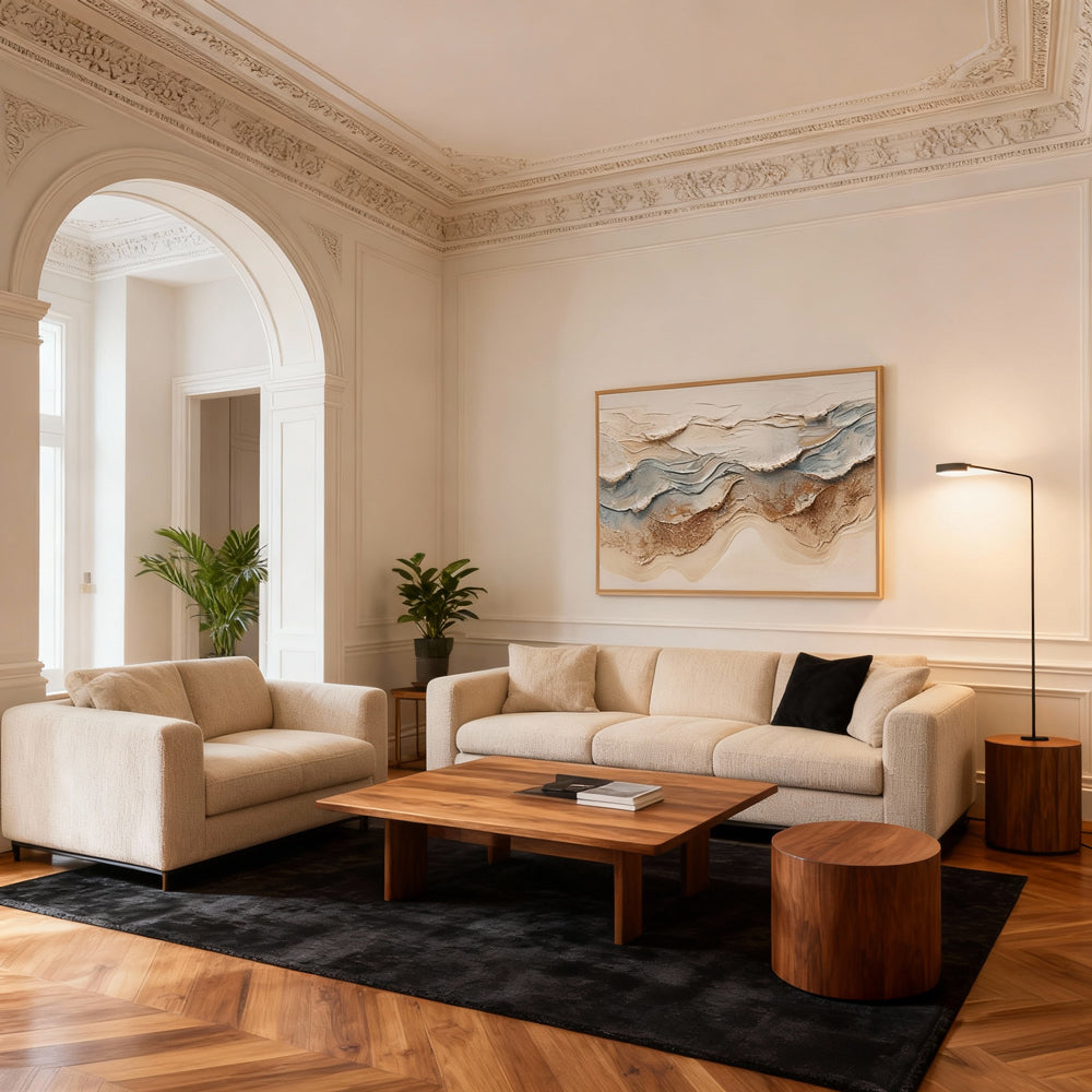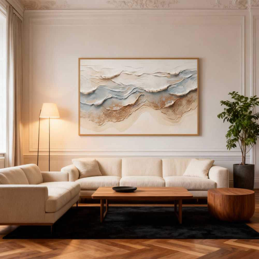 This handcrafted oil painting captures the fluidity of the ocean with soft, flowing waves and soothing natural colors. The textured surface and vibrant contrasts in the piece bring a dynamic yet tranquil energy to any room. Its unique, handcrafted nature ensures no two pieces are alike, making it an ideal addition to elevate the décor of your home or office with a touch of coastal serenity.