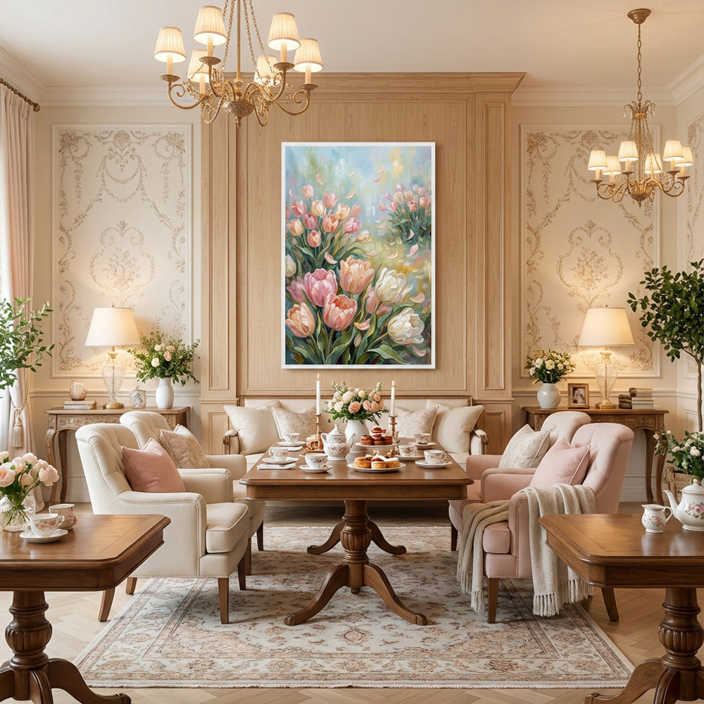 This piece highlights the charm of impressionist florals through delicate brushwork, gentle gradients, and floating petal movement. The tulips bloom with soft luminosity, creating a serene yet uplifting scene. Its standout feature is the layered depth of the floral clusters, allowing the viewer to feel immersed in a breezy meadow bathed in early morning light.