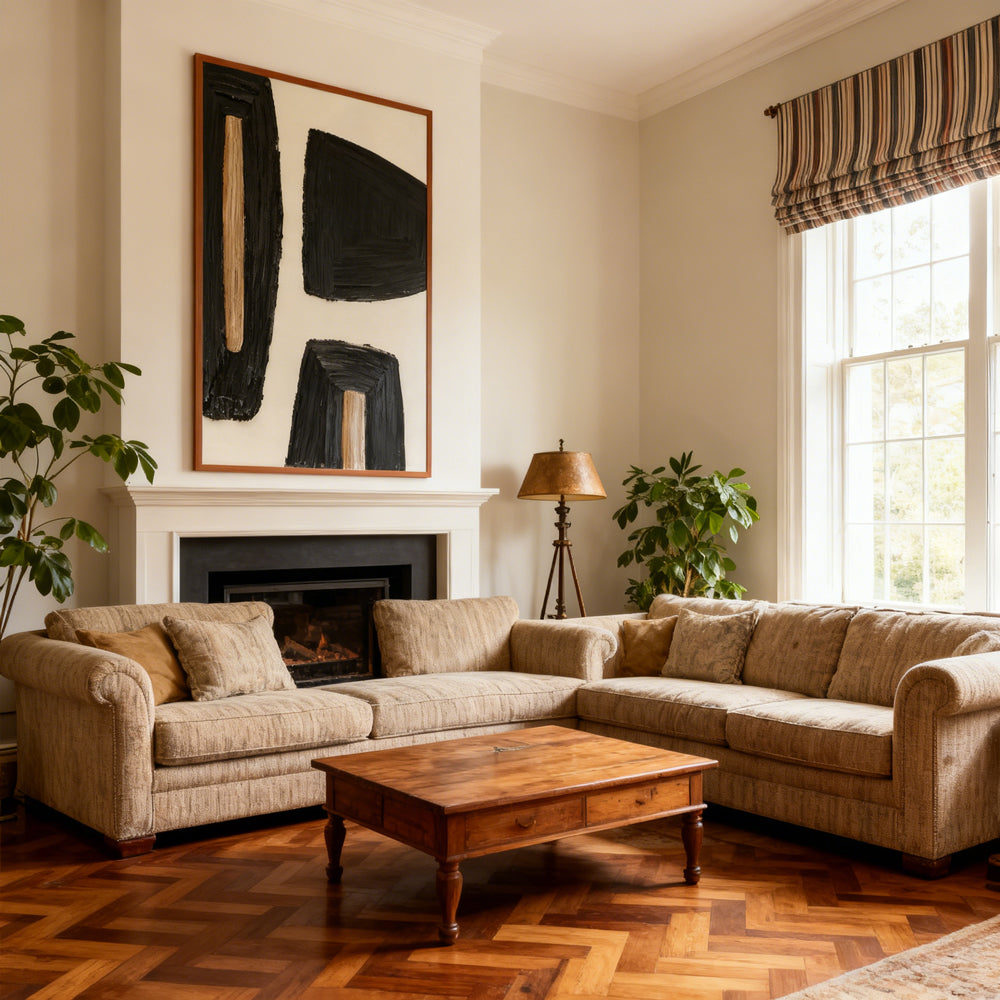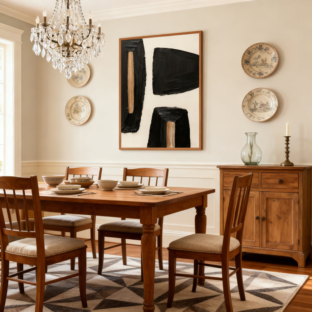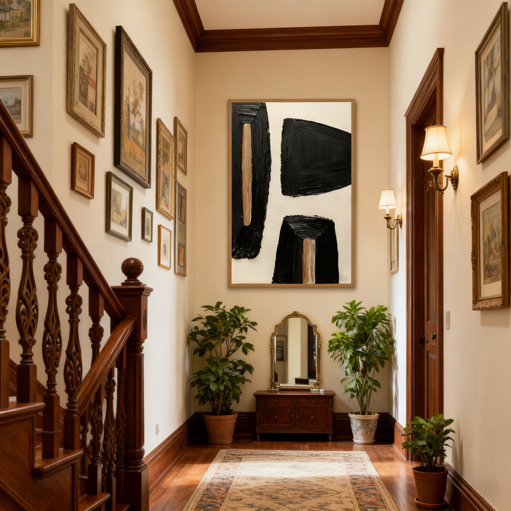 Features bold black geometric impasto blocks paired with warm neutral accents, expressing modern minimalist abstraction.