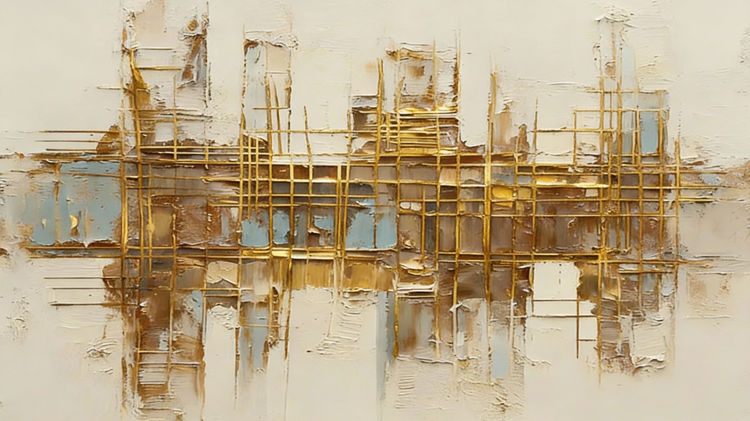 Features a structured golden grid layered over textured abstract blocks, blending geometry with expressive impasto strokes.