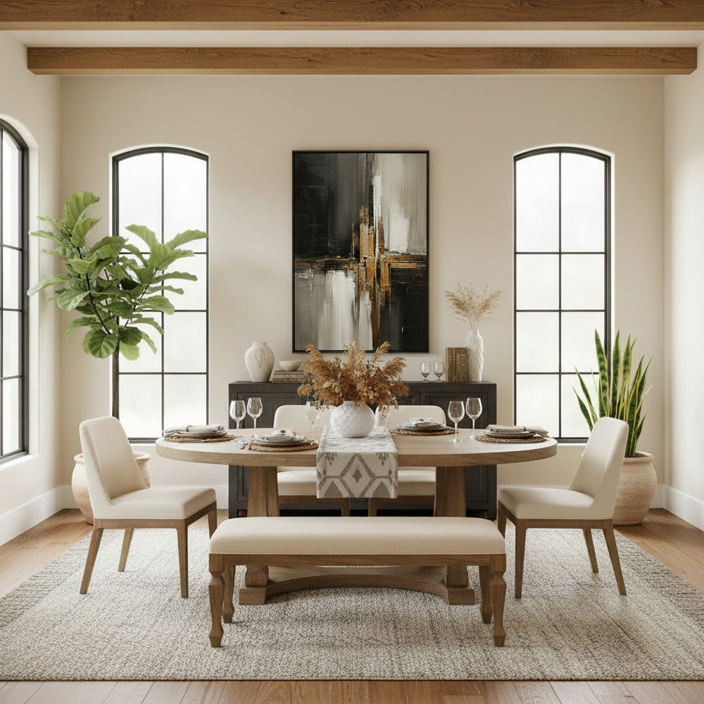 • Modern Abstract Design: This piece combines dynamic contrasts of black, white, and gold to evoke sophistication, ideal for contemporary spaces.