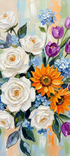 • This artwork is created in a modern floral impressionist style, featuring an elegant bouquet of roses, sunflowers, and delicate blossoms. Creamy whites, soft blues, vibrant orange, and gentle purples are harmoniously layered, creating a sense of balance and warmth. The artist uses expressive hand-painted strokes to build texture and depth, allowing each flower to feel lively and dimensional. Painted entirely by hand, no two artworks are ever the same. As a refined wall art piece, it evokes serenity, elegance, and natural beauty, making it ideal for living rooms, dining spaces, or cozy interiors.