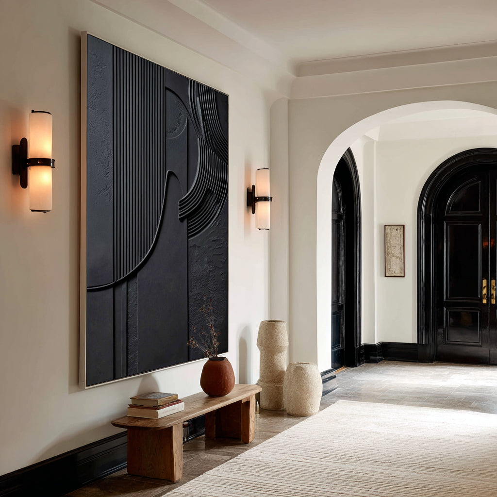 Bold Abstract Design Large-scale composition features striking black lines against a moody background, creating dramatic contrast and modern energy.  -