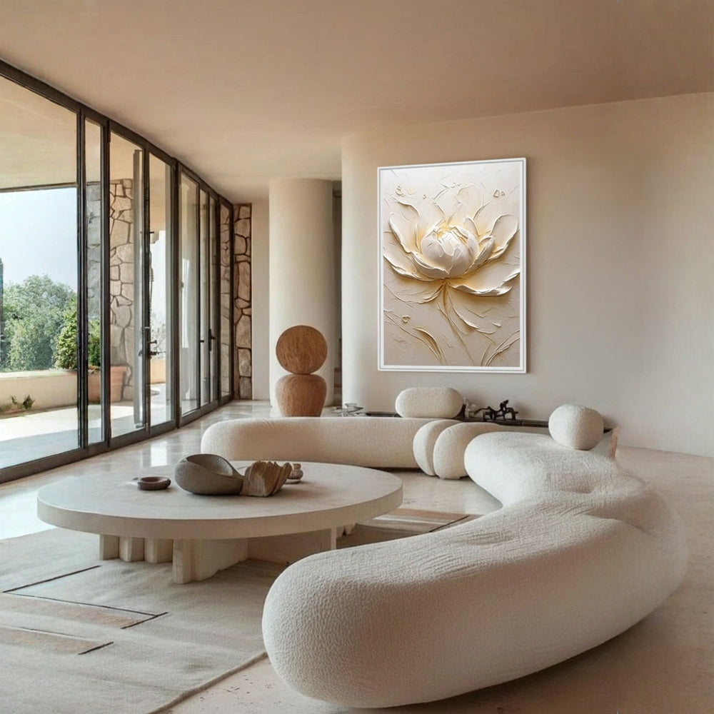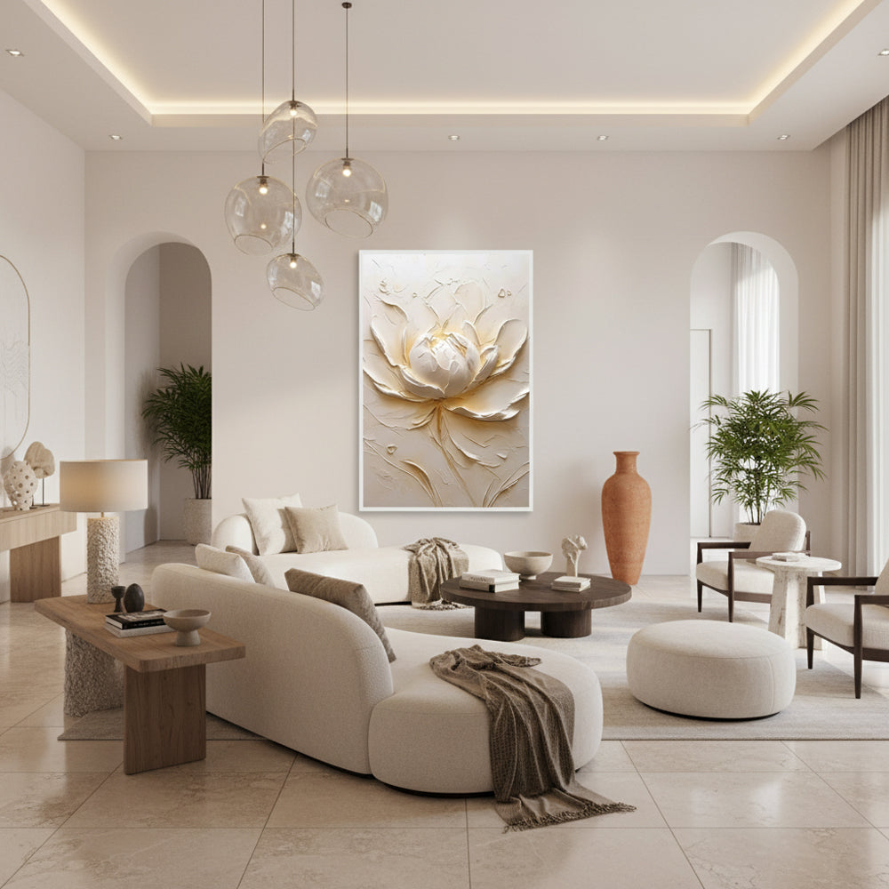Features sculpted palette-knife petals in warm ivory and soft golden tones, presenting an elegant impressionistic floral aesthetic.