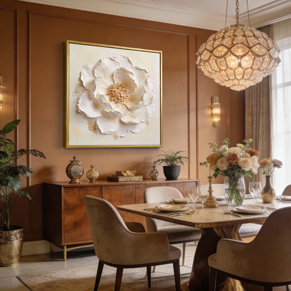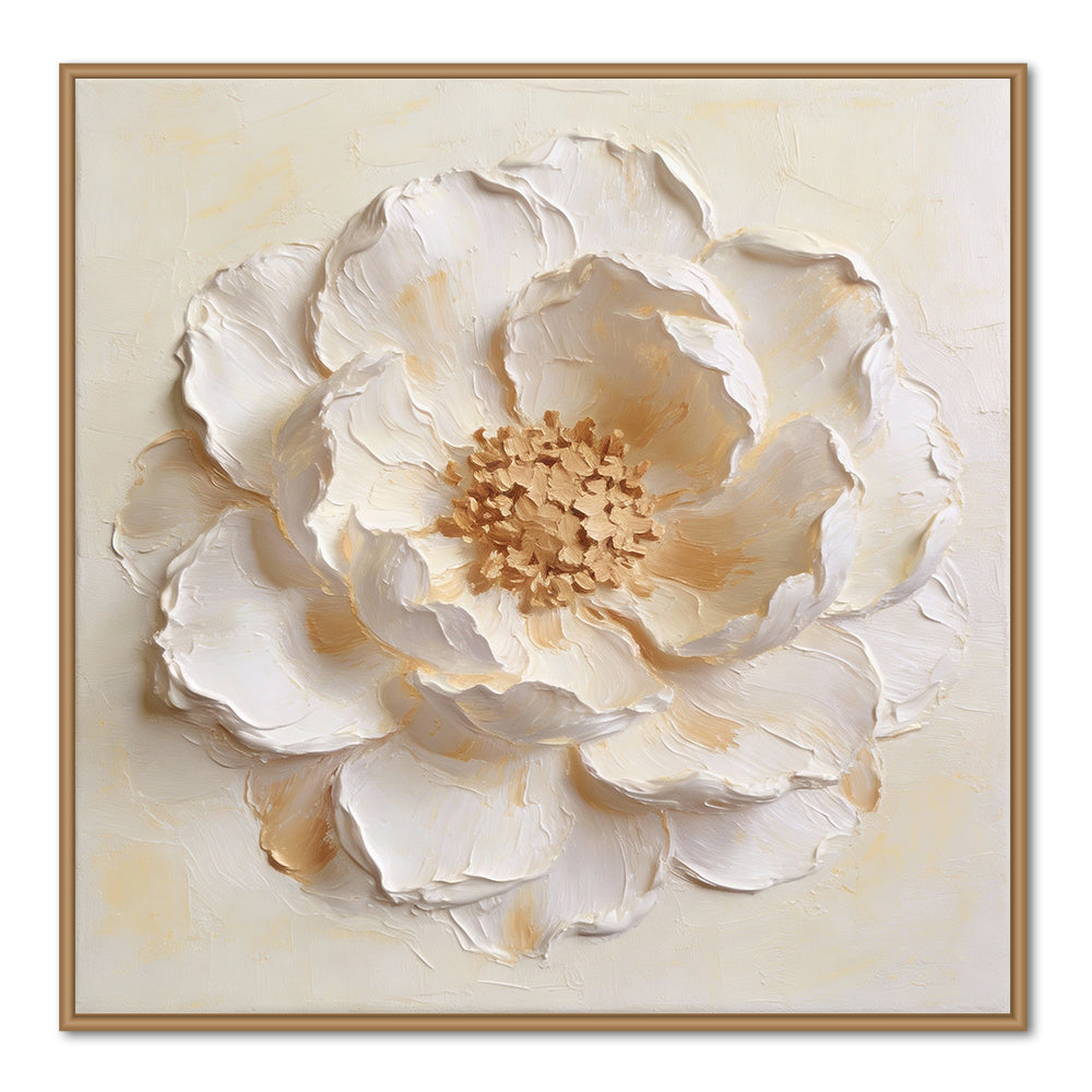 Silent Petal Harmony presents a blooming white flower through flowing, textured brushwork that emphasizes movement and softness. Subtle cream and warm ivory hues blend seamlessly, creating a tranquil and balanced composition. Influenced by contemporary impressionism, the artwork focuses on emotion and atmosphere rather than precise realism, inviting viewers to slow down and reflect. Every layer of oil paint is applied by hand, resulting in rich surface variation and natural imperfections that make each piece one of a kind. Designed as elegant wall art, this painting enhances modern interiors with a sense of calm, purity, and refined artistic expression.