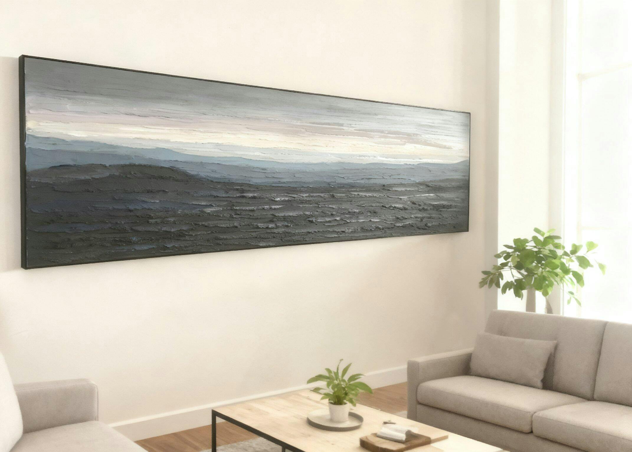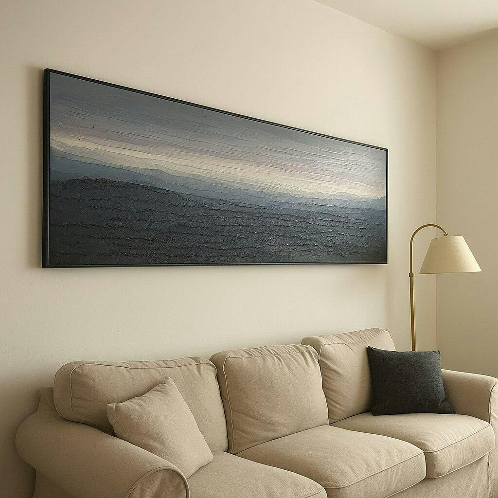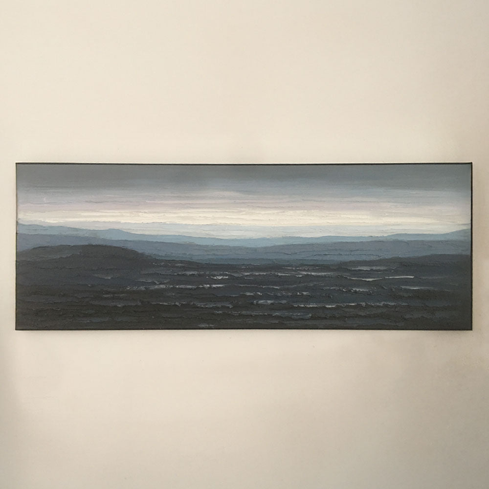Created in a modern abstract landscape style with layered impasto strokes that evoke distant mountain ridges under soft twilight.