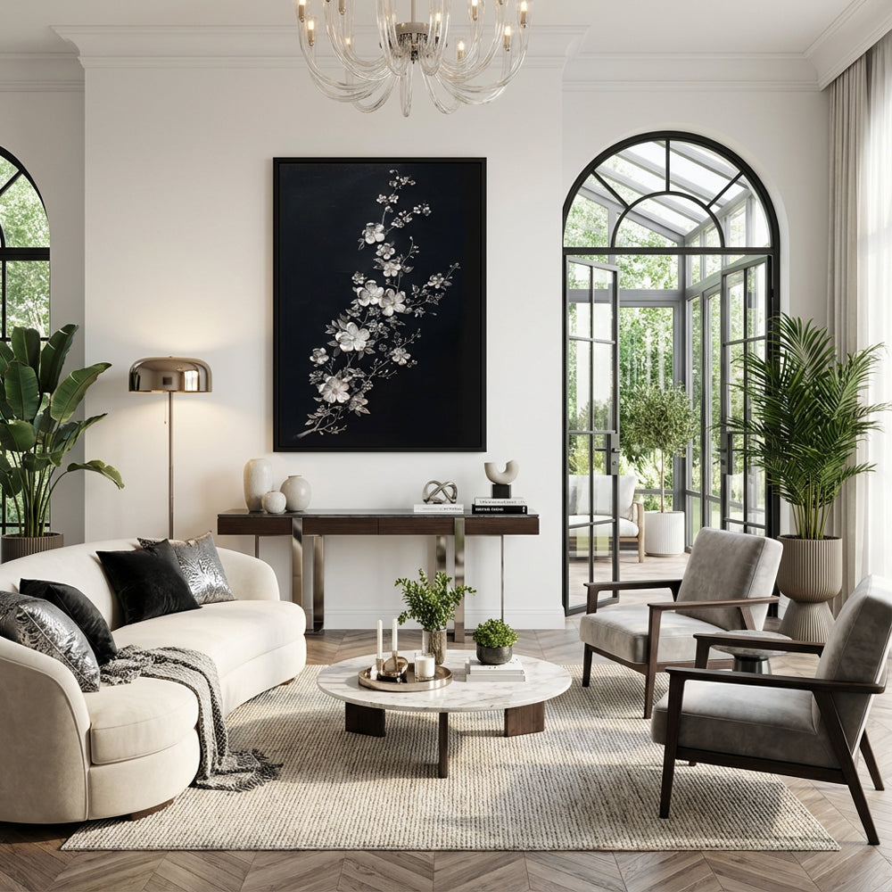 This artwork uses a modern relief technique to shape elegant silver blossoms that bloom gracefully across a matte black canvas. The textured petals and fine branches create a refined, sculptural effect, bringing depth and quiet beauty to the composition. Entirely handcrafted, each piece holds its own unique textures and artistic expression, making it a distinguished wall art addition for contemporary, high-end spaces.
