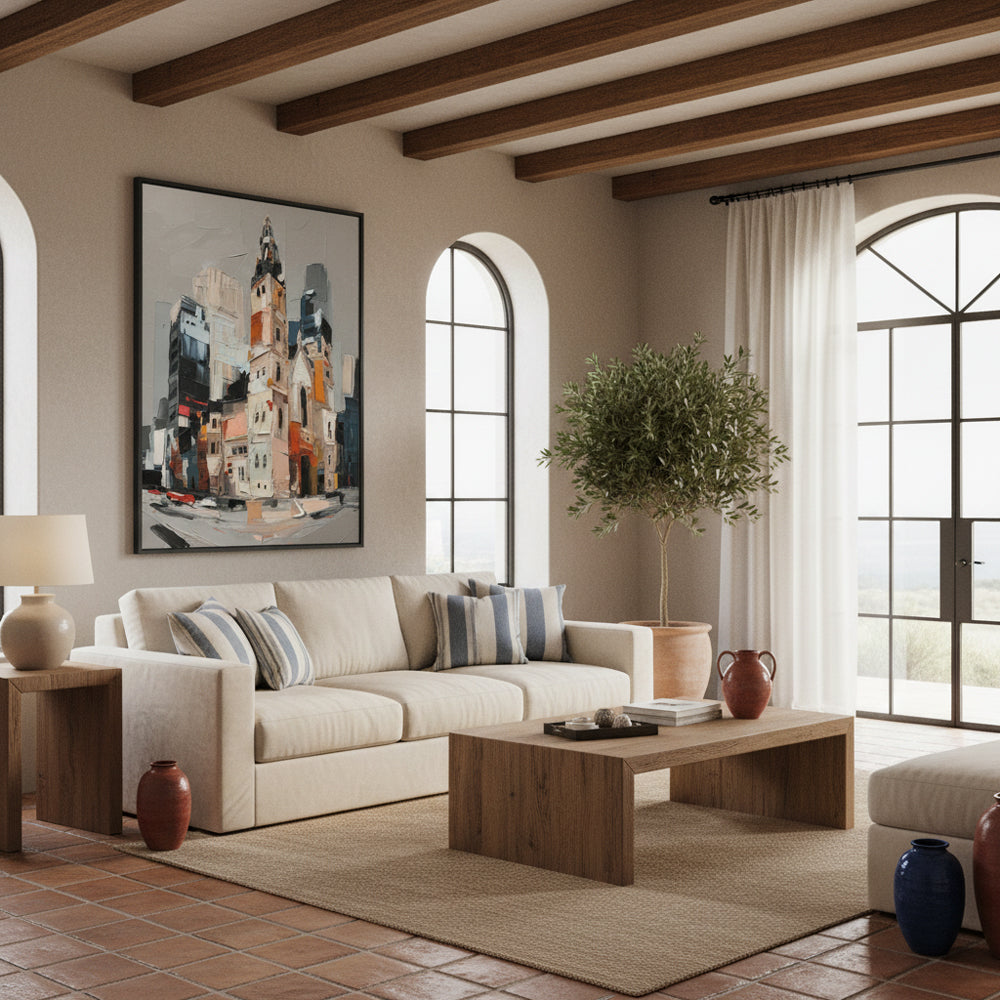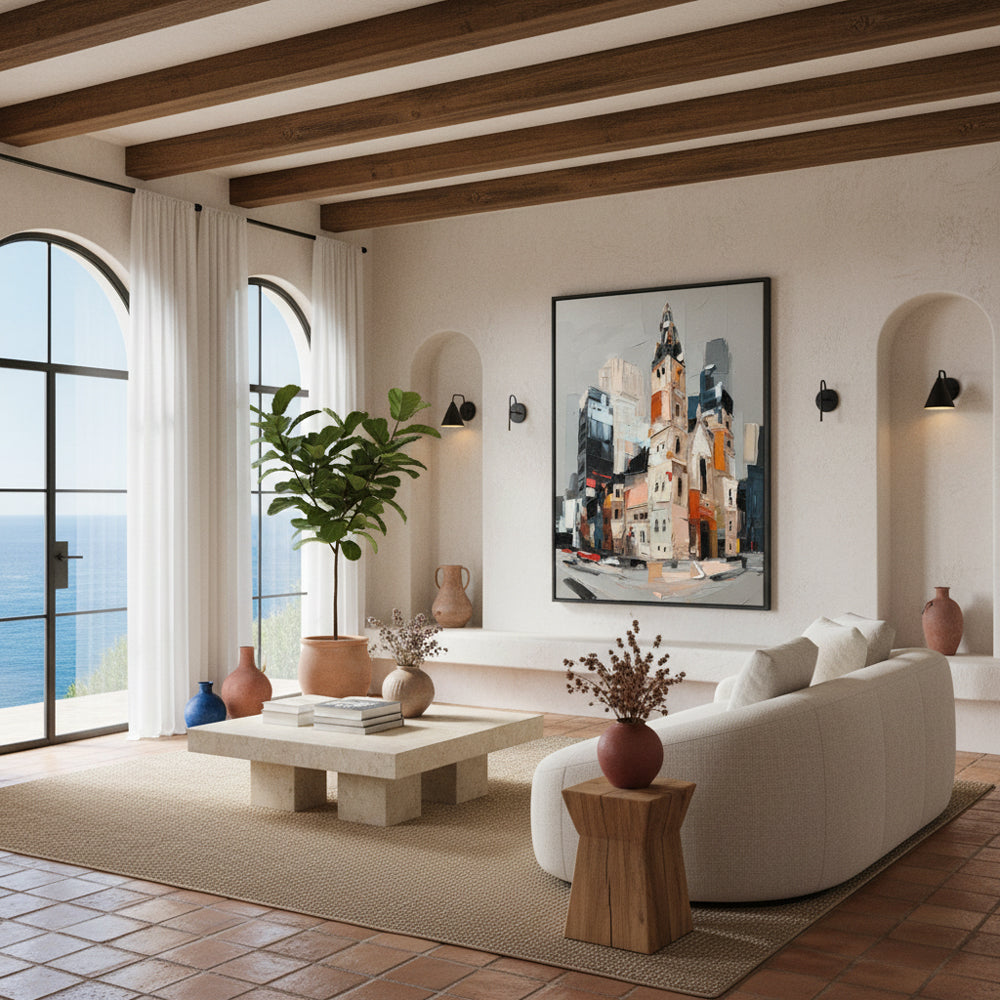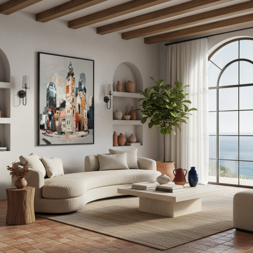Modern Artistic Touch: The abstract depiction of a cityscape adds a contemporary flair to any room, making it a perfect focal point.