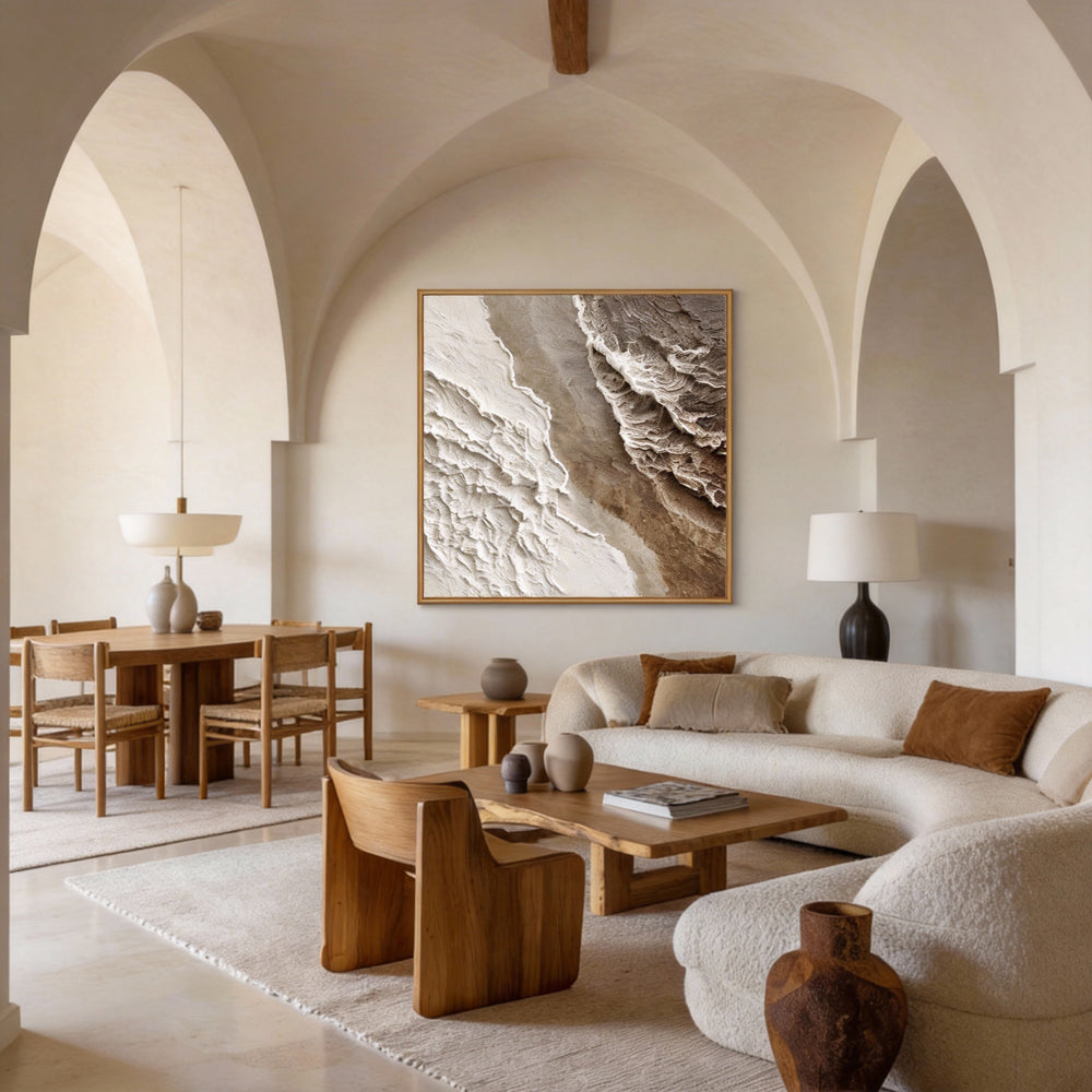 • Neutral Tones: The earthy beige and white tones create a calming atmosphere, making it ideal for living rooms or bedrooms.