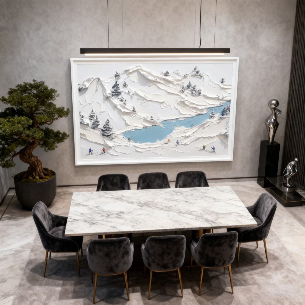 This striking winter scene is painted using palette knife techniques to create a high-textured, layered effect. The snowy mountains and crystal-clear lake are beautifully captured, with vibrant skiers adding a lively touch to the serene landscape.